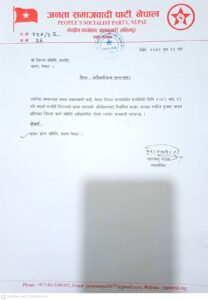 सर्लाही, पुस १५ — जनता समाजवादी पार्टी (जसपा) नेपालले सर्लाही जिल्लाको जिल्ला कार्यसमिति आधिकारिक रहेको स्पष्ट पारेको छ। पार्टी केन्द्रीय कार्यालय बालकुमारी, ललितपुरले बुधबार एक पत्र जारी गर्दै मिति २०८२ भाद्र २२ गते सम्पन्न सर्लाही जिल्लाको प्रथम एकताको अधिवेशनबाट निर्वाचित अध्यक्ष रणधिर कुमार यादवसहितको जिल्ला कार्यसमिति नै आधिकारिक रहेको जानकारी गराएको हो।